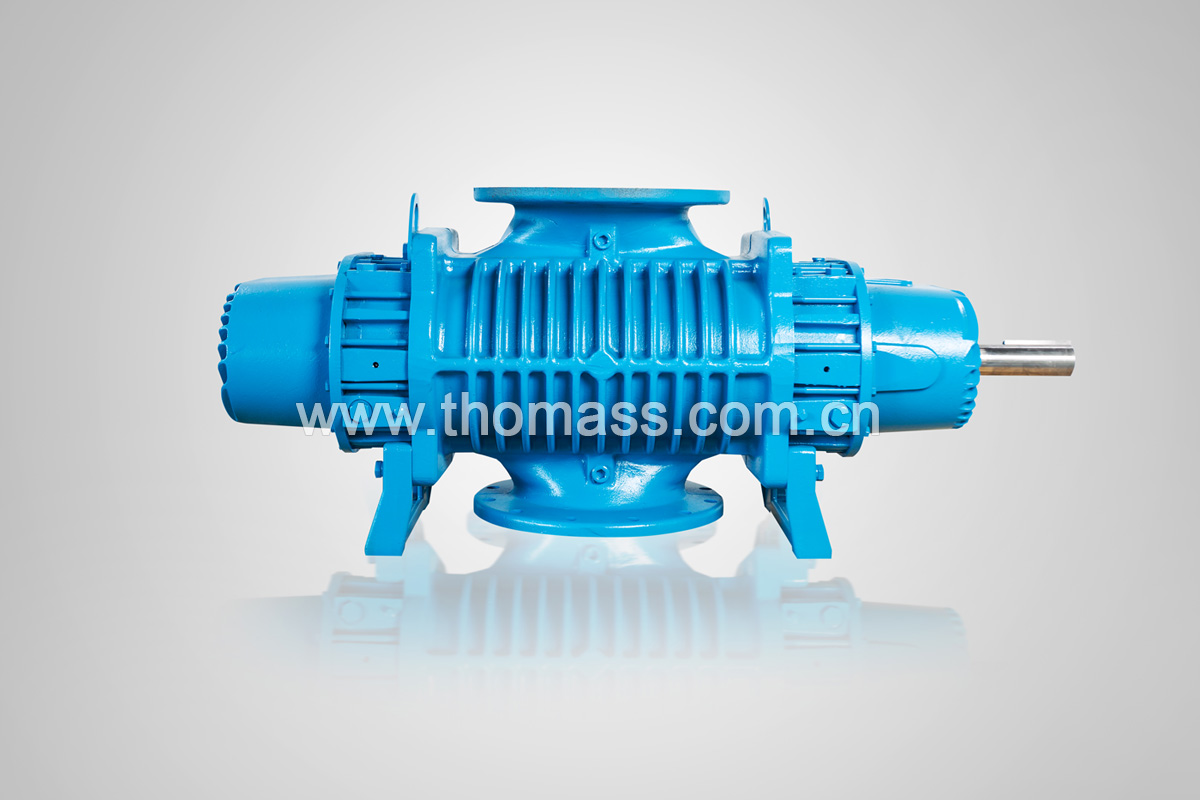 二个转子被支承在泵壳的二侧面端盖的轴承中,依靠一对同步齿轮使二个转子在高速旋转时始终保持着一定的相互位置。